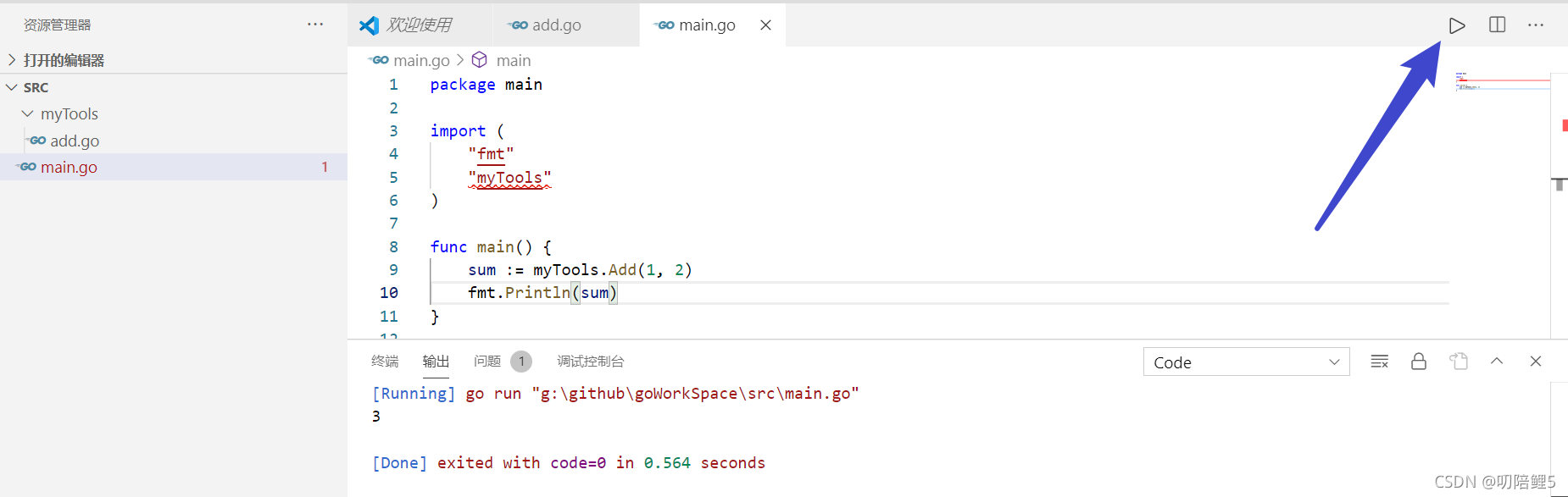 举个很简单的例子:src目录下有个main.go文件, 引用了当前目录下myTools文件夹中的Add函数: