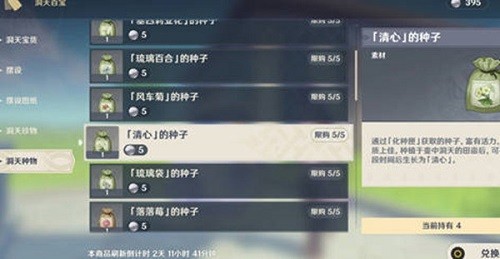 3:采集是获得清心的同时还能获得清心种子,另一种获得方法就是尘歌壶的洞天白宝洞购买,如下图所示,一个星期可以购买五个,这个还是蛮值得购买的,大家要记得去买。