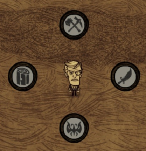上面的斧镐交叉标志是消耗30san值上限召唤一个暗影劳工【上限召唤6只,但召唤第六只会导致刷影怪,因此建议只召唤5只】,会自动砍伐附近的树木和资源,并且捡起来送到老麦附近,在建家后密集种植物资时地方可以使用,可以十分方便的大量采集资源,但是由于加了范围【接近满耐久矿灯帽光照范围】,而且有了存在时间限制【四分钟】,所以实用性下降了一点