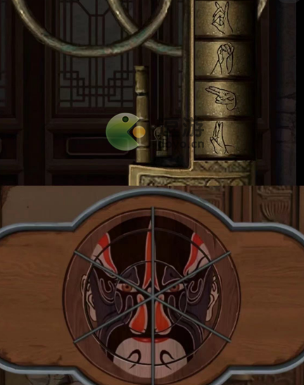 14、(院子-左)点击房间门上的密码锁,根据书上的手势线索和灯笼上的文字顺序(拂云、垂露、怒发、浮香),转动图案至正确位置,打开房门
