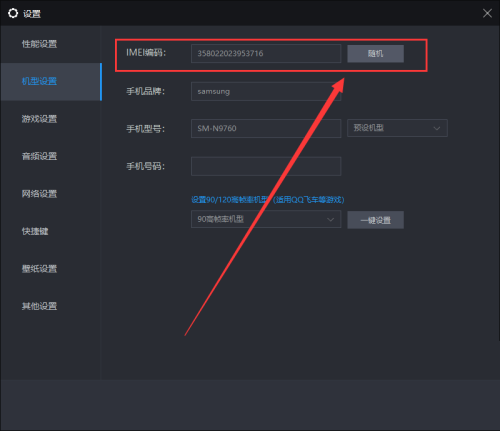 3、最后在机型设置界面,找到IMEI编码后的随机按钮,点击它就能更改IMEI编码,然后保存设置即可保存编码。