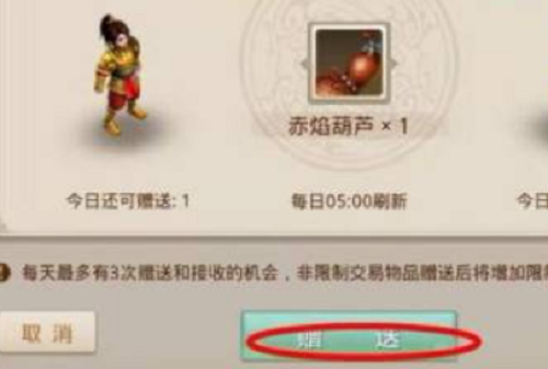 1、好友赠送:需要双方都达到50级,并且好友度达到5000以上。每天最多赠送三次,部分贵重物品不能赠送,而且赠送的物品在三天内不能交易。